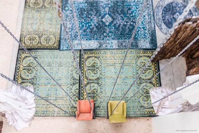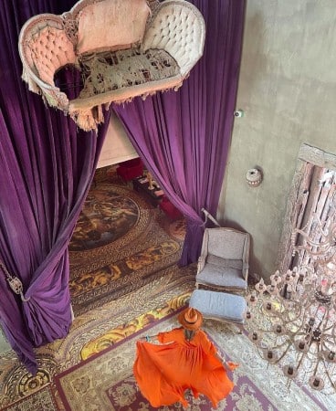 Entering The Casa, I walked over handmade Persian rugs, thrown casually over the stone floor entrance. On either side, a floor to rooftop curtain was attached and on closer inspection, I became aware that the curtain was made of old wedding dresses, joined together – yes, two entire drapes of wedding dresses that formed a curtain.