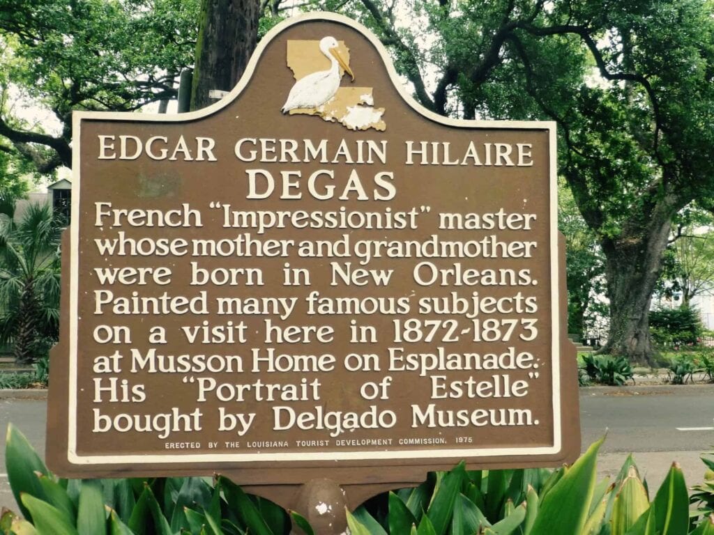Two conspicuous historic signs stand on the brick paved sidewalk outside the house where Degas spent five months in New Orleans, drawing attention to the house where he lived.