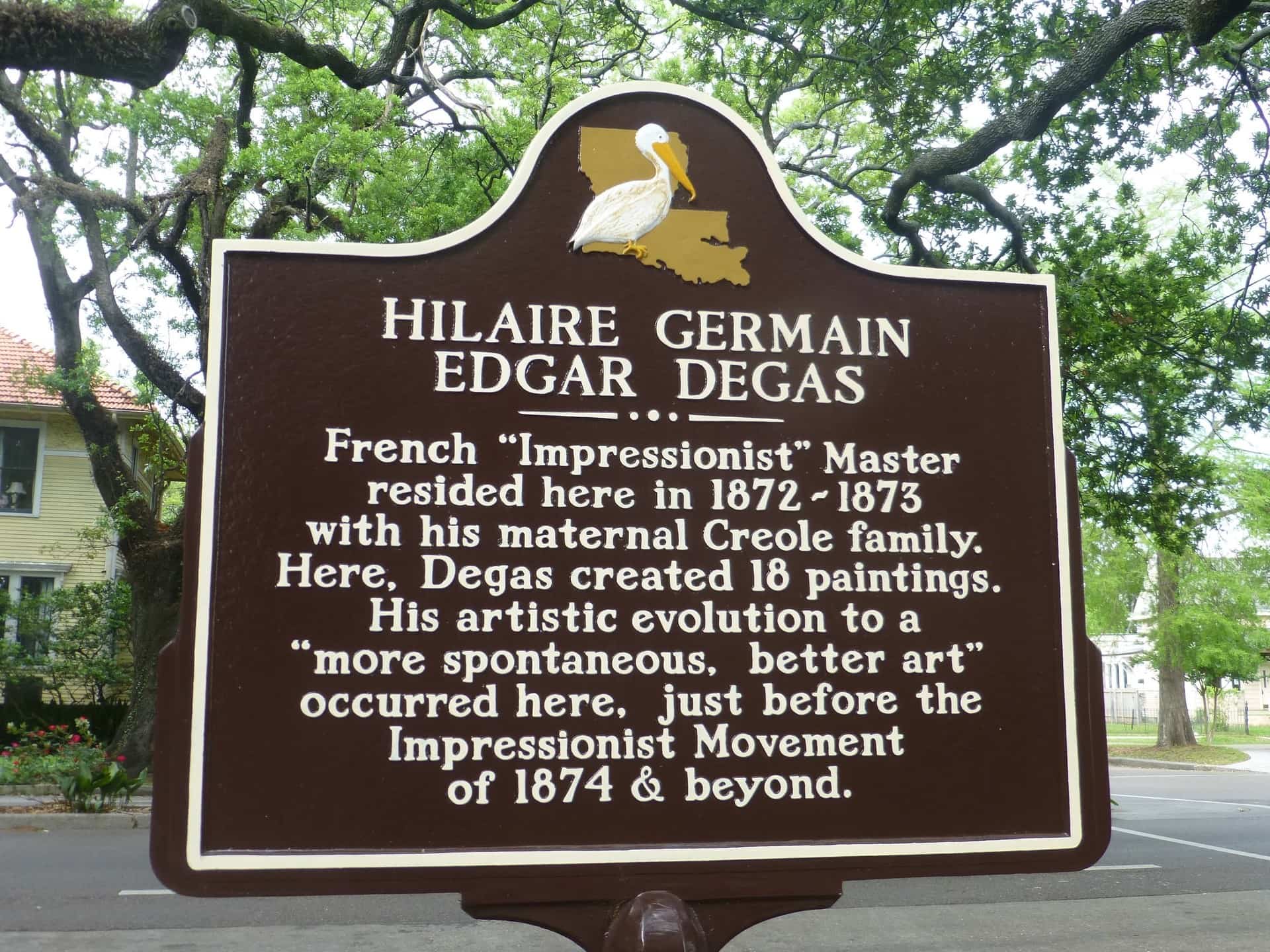 Two conspicuous historic signs stand on the brick paved sidewalk outside the house where Degas spent five months in New Orleans, drawing attention to the house where he lived.