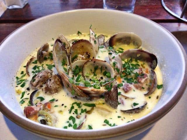 The broth gets its consistency from the ingredients and allows the soup to cook slowly and reduce. This clam chowder has a fresh tasting creamy broth filled with tiny manilla clams and tastes as good as it looks. For those wanting to make this recipe, it is available on the internet.