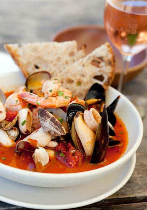 Another soup that is in demand is a Fish Stew. This is similar to Cioippino, the San Francisco version of Bouillabaise, except that it does not use crab. The broth is made from tomatoes, wine, garlic, clams, mussels, parsley and cod. It cooks slowly reducing by half before the seafood is added, allowing all the flavors to blend. It is served in a bowl with two slices of Acme wholewheat bread, (one of the local purveyors) for dipping into and slurping the Fish Stew. This recipe is also available on the internet.