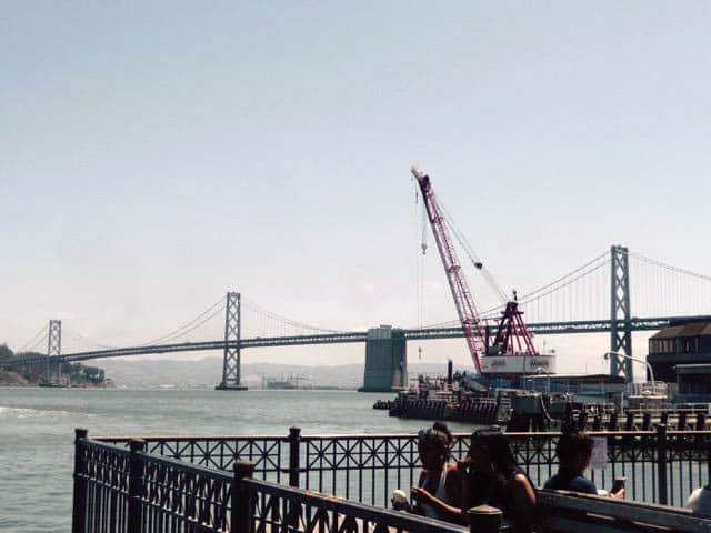 From the outside terrace there is an unobstructed view of the Bay Bridge with its continuous flow of cars and trucks.
