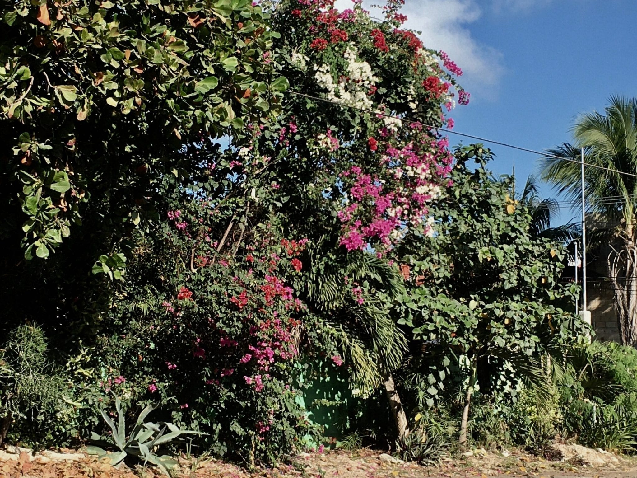 The price of the largest homes is now in the one million US dollar stratosphere — and all prices are quoted in US and Canadian Dollars. Still, the town remains friendly and one can stop and chat with people in the street. In this part of town, though, the streets are quiet with almost no traffic as it is away from the central square. I loved the different greens of the tropical plants and the vibrant color of the flowers and rampant climbers, with tall palm trees laden with coconuts, silhouetted against the blue sky.