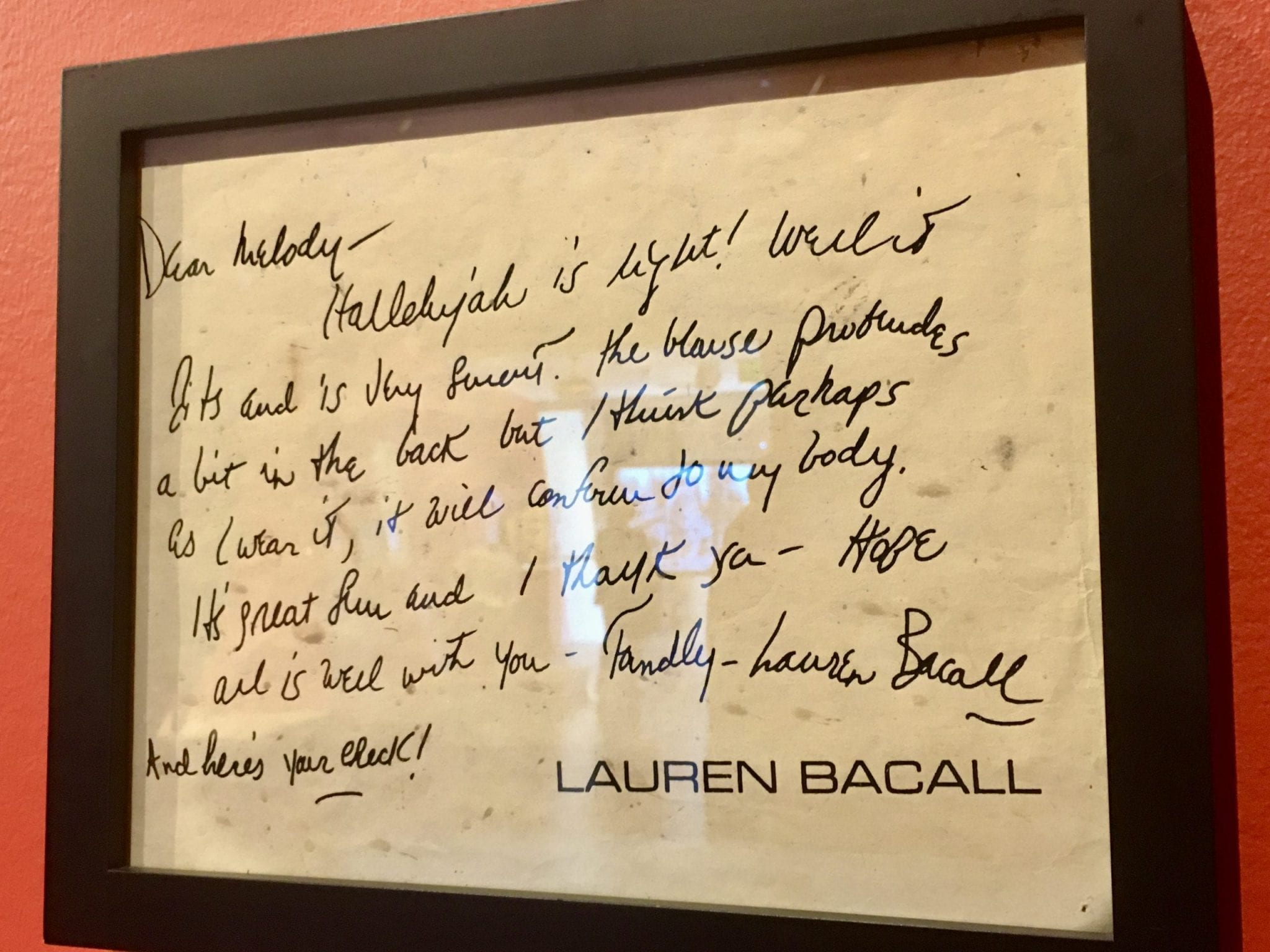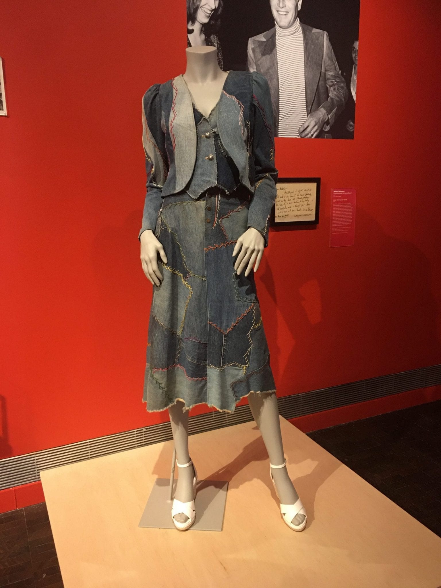 Imagine: a chance meeting between Lauren Bacall and Melody Sabatasso, a young designer who was living at the back of her Marin County boutique trying to make a living and using repurposed Levis in her designs. This is the dress she created for Ms. Bacall in 1967 and the handwritten letter from the Hollywood star to Melody Sabatasso. It was the genesis of Sabatasso’s career, designing for Hollywood celebrities and performers, and it began with a pair of used Levi jeans.