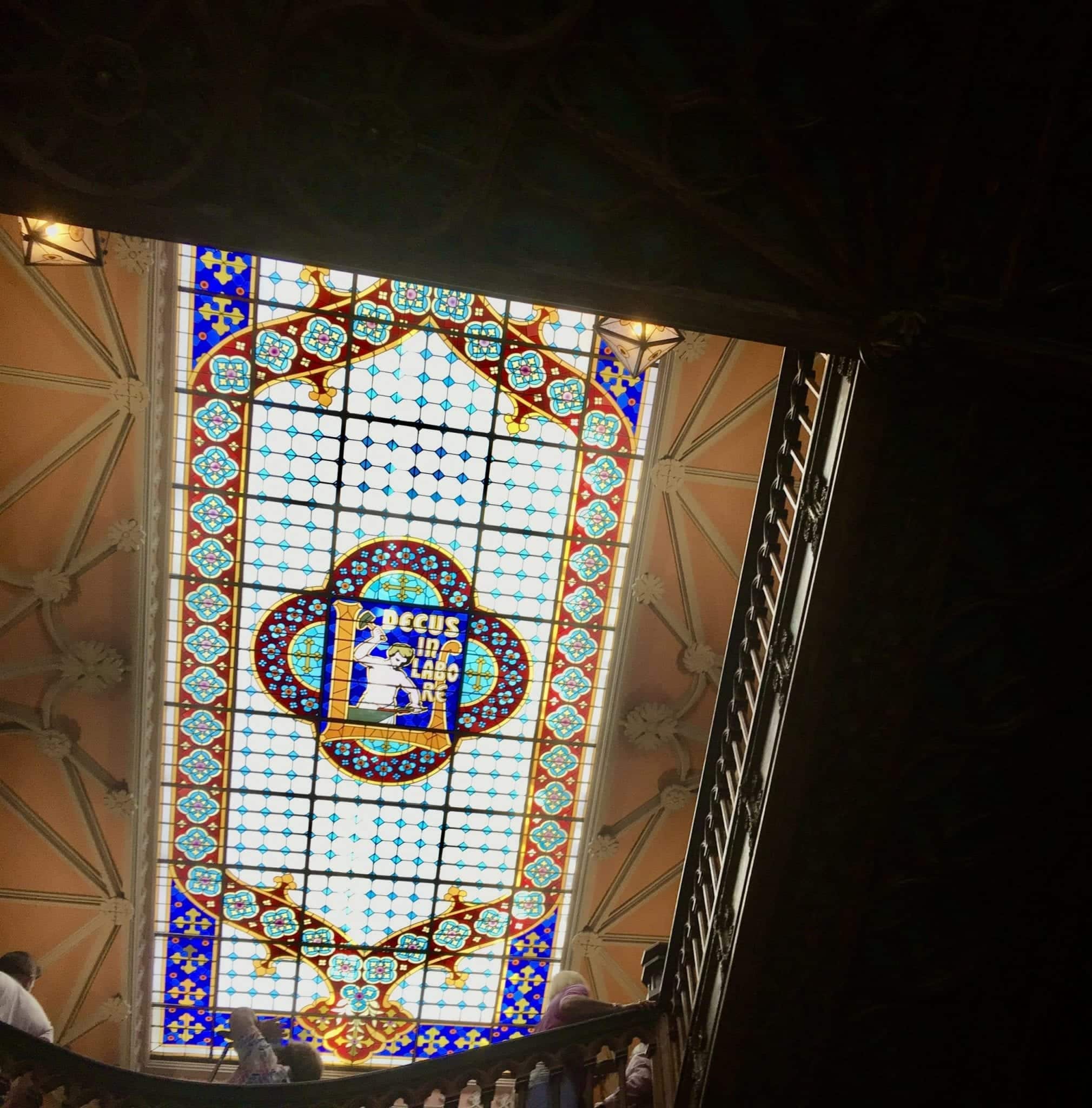 Set within the ceiling is an impressive 26×11.5-foot stained glass panel with the slogan Decus in Labore (“Dignity in Work”) at its center.