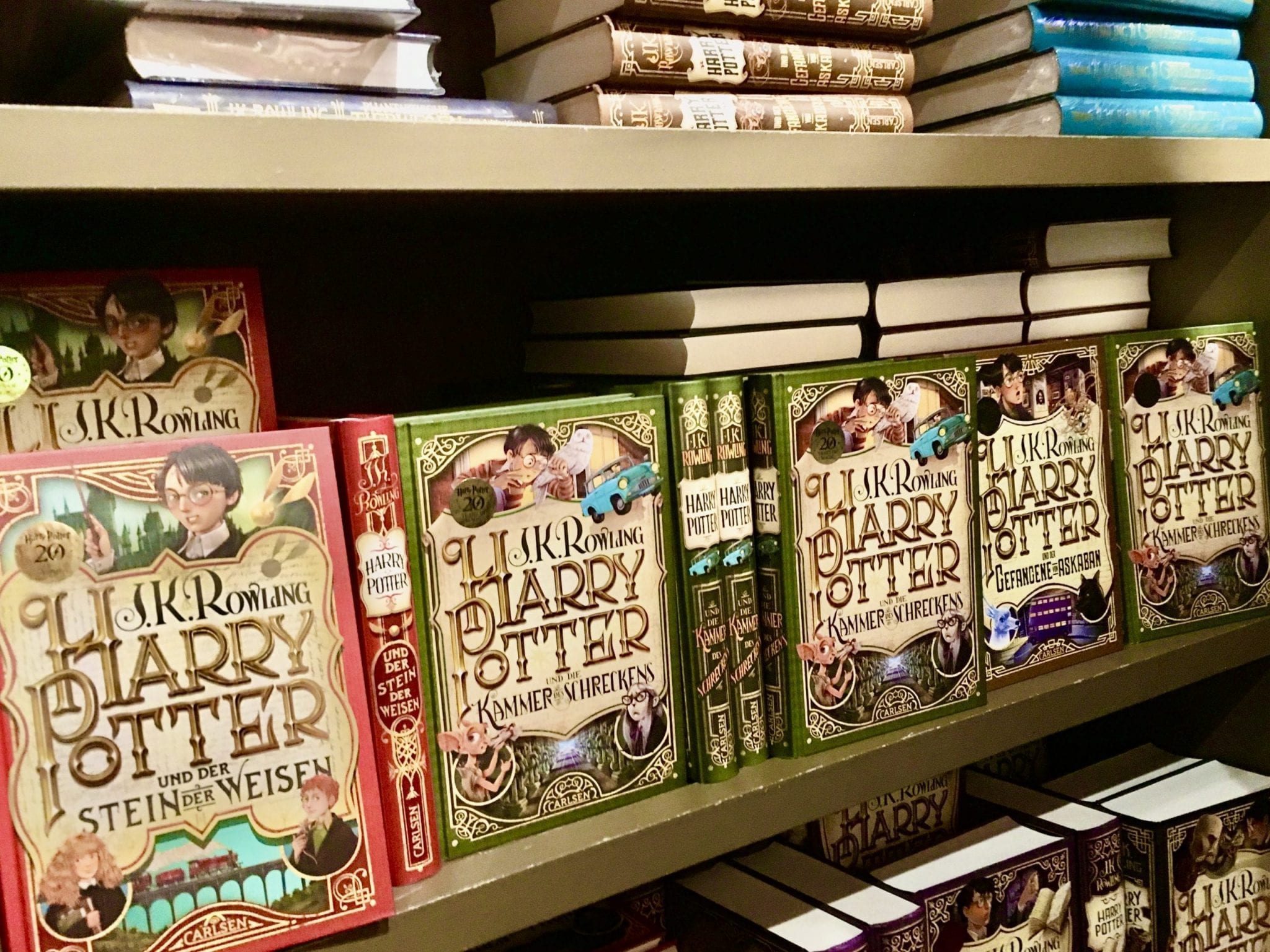 Two floors, with decorated columns that extend throughout, connect the lower to the upper gallery floor. These and the central stairs’ banisters are embellished with gothic style carvings. The walls are lined with wooden bookshelves with a good selection of books, covering many subjects and authors; but front and center are the Harry Potter books.