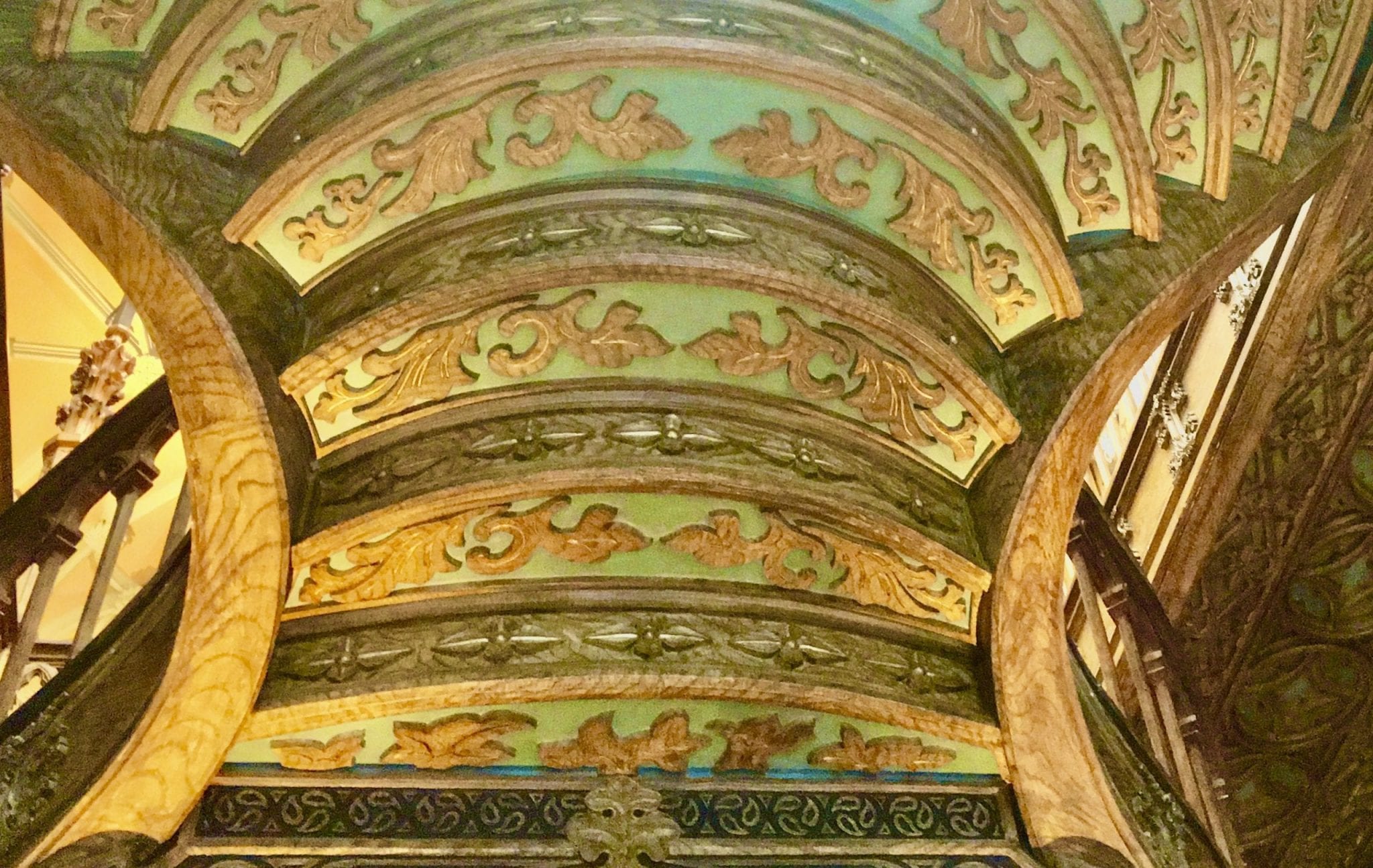 Looking upwards, the ceiling appears to be made of carved wood appliquéd onto the ceiling — whereas in reality, it is plasterwork, resembling carved wood. This is an incredibly difficult process and required the finest artisans to execute.