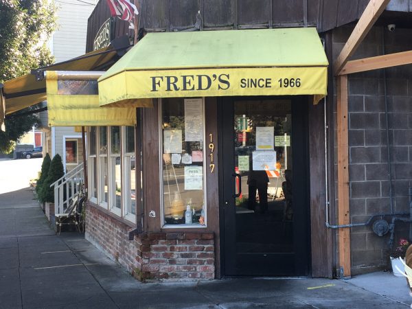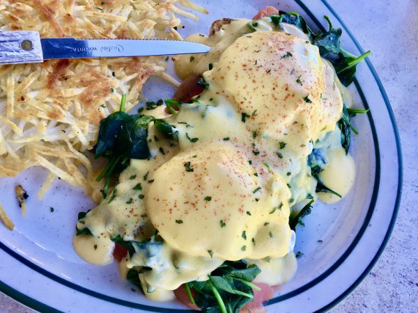 Look for the yellow banner with the name Fred’s Diner, and you’ll find a Sausalito institution, since 1966, that I believe has improved with age. The food is sensational! I ordered the eggs benedict with hash browns and a cup of coffee. Served on a bed of spinach, the eggs were perfectly poached and the homemade hollandaise sauce was silky perfection. Paired with golden brown and crispy hashbrowns, I was pleased with my choice. Then I saw the French toast coming out of the kitchen, double dipped to make it crispy, crunchy on the outside, and gooey on the inside — one portion was enough for a family! This was followed by scrambled eggs and omelets and their famous millionaires’ bacon, extra thick and sweet. This is an extensive menu with a number of irresistible dishes. Since covid, extra tables are arranged on the sidewalk. Service is efficient and fast, and mostly polite — it is, after all, a diner!