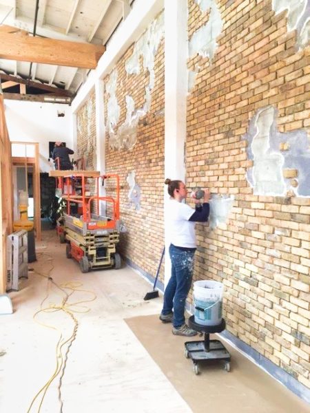On the right-hand side of the warehouse, the entire wall running the length of the property needed restoration, too — so the family stripped the wall back to the cinderblock. Matching antique honey-colored bricks were sourced from a supplier in Chicago and shipped to Benicia, and applied with several batches of grout were mixed to find the”right” color, eventually choosing a grey, to contrast with the honey-colored bricks. Using a pastry piping bag, Hannalee meticulously piped the grout between the layers of brick — not exactly what she was taught to do at the Cordon Bleu School, but necessity is the mother of invention.
