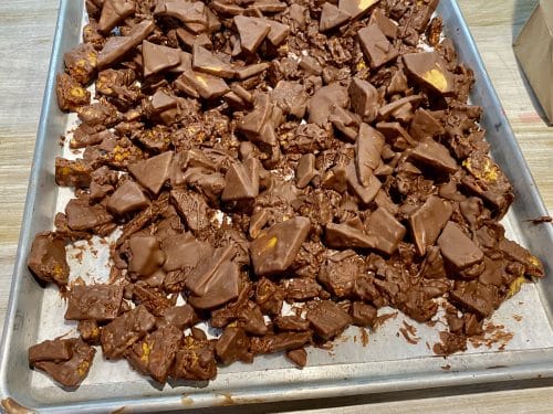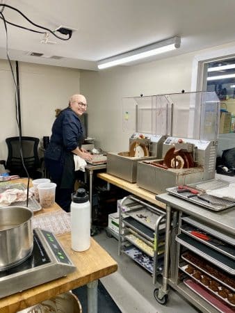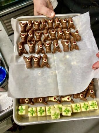 Catherine is the chocolatier, and she is also very involved in the kitchen, where she knows every station. Some of the recipes used in the bakery are old family recipes — and when I visited over the holidays she was in charge of the chocolate station.