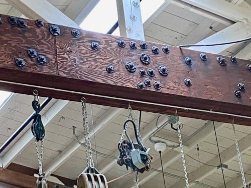 New beams were copied to match the original ones, and fifteen different stains were mixed until they found the perfect desired color, and, malleables (black re-enforcing metal circles) were added to the beams to make them more authentic. Hannalee and her Mother, Catherine, had sourced the malleables from different places, architectural salvage yards, antique markets, and Phil Joy, who was living in Benicia — they then scrubbed and stripped every malleable and spraypainted them, allowing the paint to drip, to make them look authentic and aged. With old buildings, the devil is in the details!