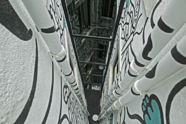 To reach the guest bedrooms, there is a colorful spiral staircase with a wooden balustrade around a glass-enclosed elevator making another interesting art-themed statement: a mural, hand-painted by one of the selected artists representing the history of the hotel and the dark days the country went through towards the end of the 20th century. As you ascend, you feel as though you are traveling through the vivid experiences of the building’s time periods.