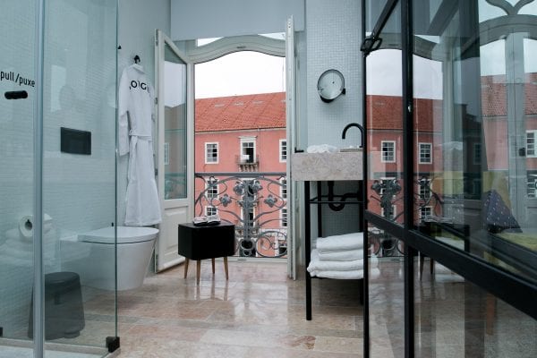 The conversion of the 1908 Lisboa apartments into a hotel created 36 guest rooms that are furnished with minimalist decor in subdued coloring. The best room in the house is the “King of Dome Suite” on the top floor, situated under the building’s dome with a living room that has a birds-eye view of the rooftops of Lisbon. Connected by stairs to the bedroom and charming bathroom one floor down, the bathroom has a ball and claw foot antique bath with shower.