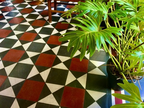 While the exterior is clearly Art Nouveau, the interior is modern, at times even Industrial, with plenty of Mid-Century furnishings that exude an upbeat and trendy vibe. The 1908 Lisboa Hotel describes itself as a restaurant, bar and, art gallery, all of which are to be found here on the ground level: the 1908 Bar, the Infame Restaurant, and a small concierge desk at the front door. A remarkable matching collection of original antique floor tiles in a geometric pattern covers the entire floor area, unifying the different spaces.