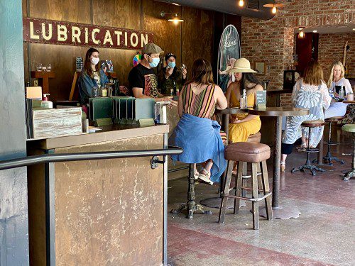 But instead, the space was imaginatively restored by vonRaesfeld architects of Petaluma and today the wine tastings are available on the gas pump terrace or inside at the bar, above which hangs a sign: LUBRICATION! But strictly of a more social sort, these days.