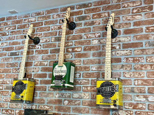 For a further reminder of the building’s mechanical past, you only have to look to the station’s wall, where you’ll find some unique handmade musical instruments: guitars made from old oil cans. Yes, they work!
