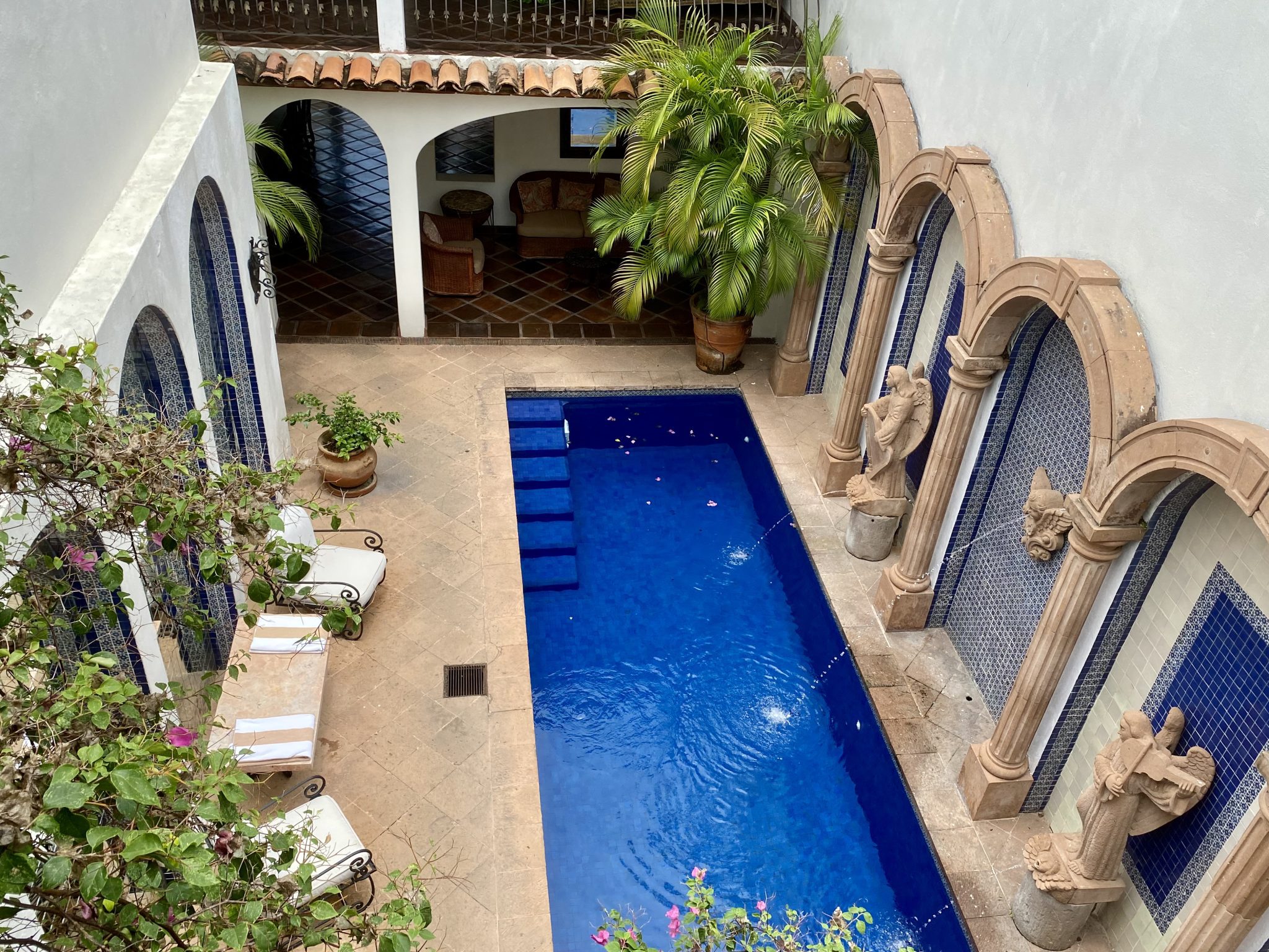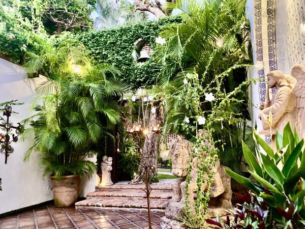 The bell brought a uniformed member of staff to the door. I was expediently welcomed inside and offered a refreshing iced drink as I sank into a relaxing chair in the covered atrium that connects all the suites. Inside is calm and tranquility as one leaves the outside world and is encapsulated into this magnificent setting, with mature trees, rambling bougainvillea, and perfumed gardenias. Steps lead to different levels, and each level opens up another vista — over rooftops, over the iconic Guadalupe Church, or clear across the Bay of Banderas. Everything is harmonious and it is like a stage-set that has been here forever.