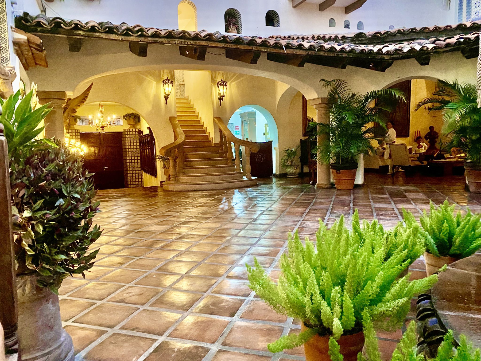 Driving up the narrow winding cobblestone streets of Centro, I arrived at the hotel located at Calle Miramar 336. The hotel logo was discretely painted on the wall and some antique tiles surrounded the double wooden door with a black iron lamp on either side. At the double wooden door, I found a heavy rope with an instruction to “pull;” I did so and it must have connected with a bell inside.