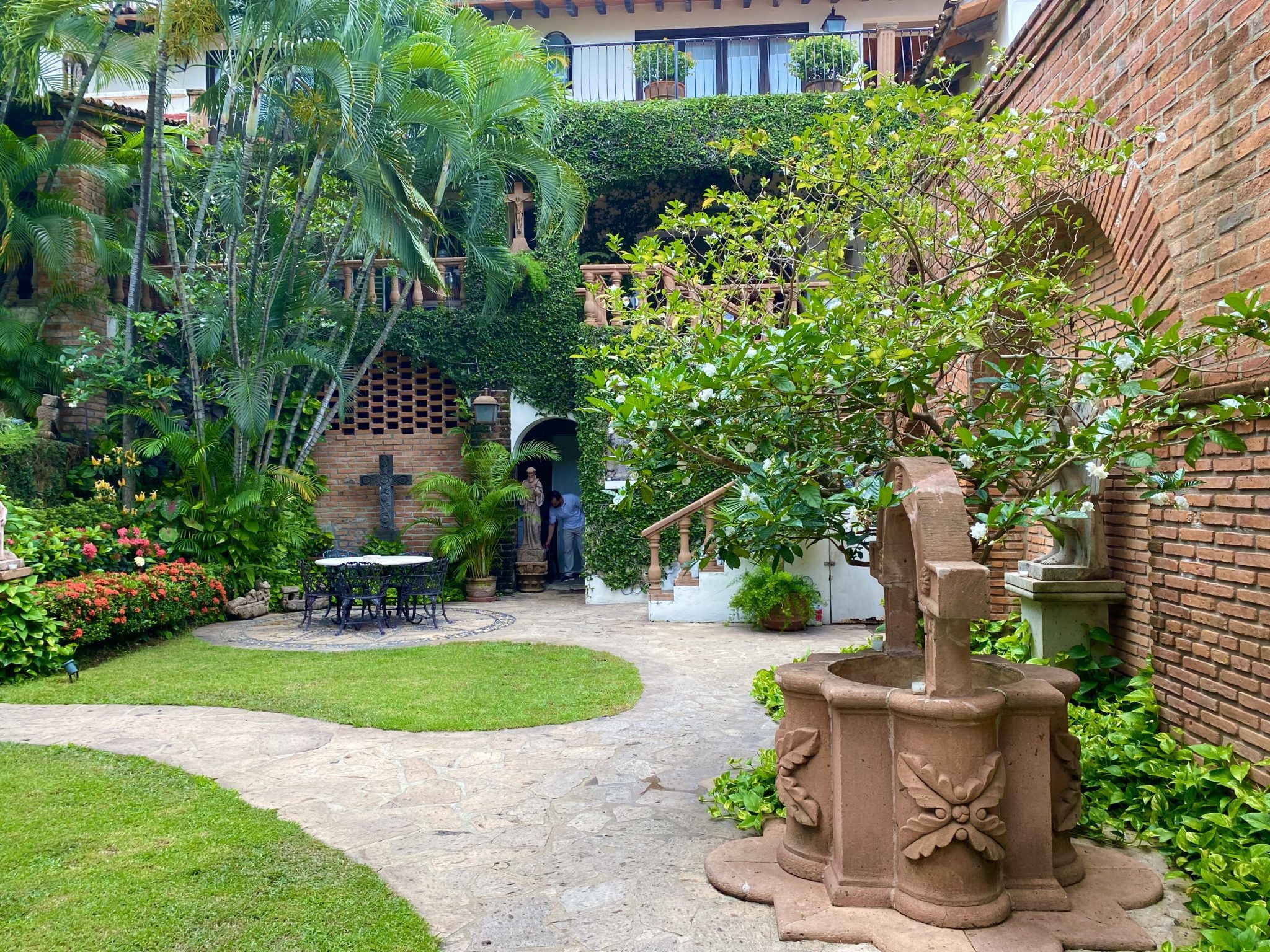 A series of outdoor staircases, their bricks worn with age, connect the different levels to the suites, interspersed with tropical flowers and leafy climbers that grow along the walls. Deep burgundy bougainvillea in full bloom had been trimmed to make it manageable, and an ancient white magnolia with a thickened trunk, its perfume wafting in the air, grows near a two-tiered trickling fountain that backs up to an old brick wall.