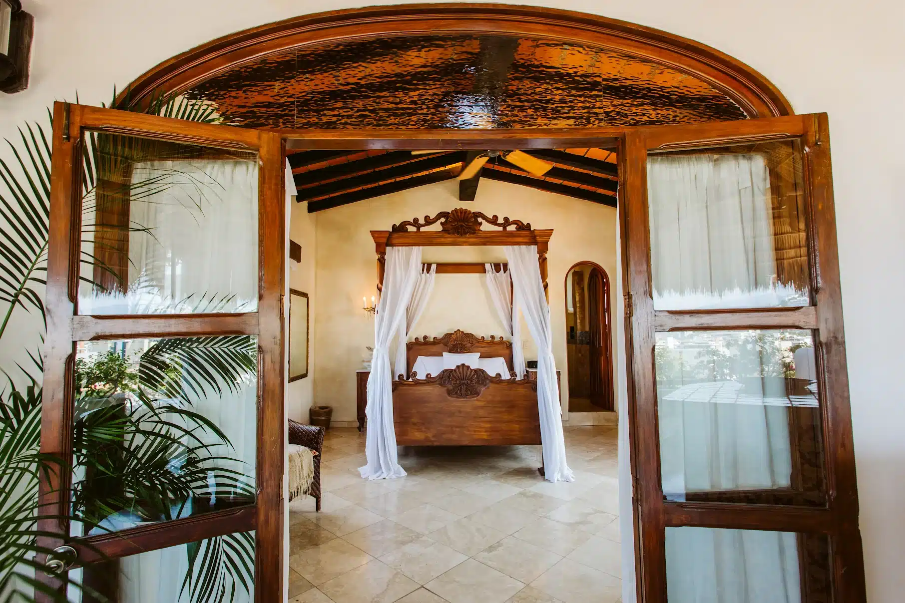 The collections were eclectic and diverse. Colonial Mexican and Spanish Colonial furniture: hand-carved armoires, headboards, dining room tables, and chairs, bells from belfries, candelabras, lights, pottery, porcelains, and handpainted tiles. Once it became known locally what was happening at the house, people began offering her antiques! The real windfall came when Museo Munoz Acosta, Puerto Vallarta’s only art museum, closed in 2003. Janice acquired large oil paintings, armoires, and even a French 16th Century French Gothic steeple that was built into the Francisco Suite.